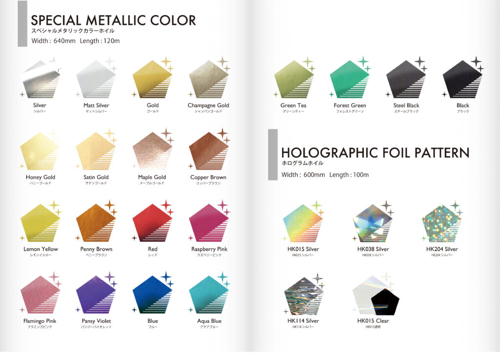 従来、金・銀を中心にご提供しておりましたカラーバリエーションに加え、新たに【20種類】のメタリックカラー、ならびに【5種類】のホログラム箔をラインアップ。